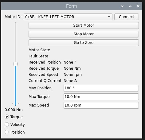It allowed me to configure the bus setup, select and connect to an individual motor, then control with different gains for either Torque, Speed, or Position. Somewhat recreating a stripped down version of the SteadyWinMotor windows program but running on the Pi, and without the random hang-ups. It definitely made trialling different things easier than changing magic numbers in the code.